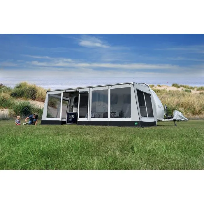* Denne variant af Rolli monteres på køretøjet som et fortelt, idet både markiser og siden trækkes i teltskinnen. Det betyder, at siderne slutter tæt mod køretøjet, så blæst mm. holdes ude.